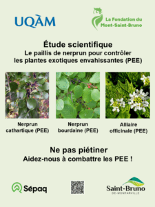 Plus concrètement, la Fondation du Mont-Saint-Bruno a ciblé cinq plantes exotiques prioritaires lors de la première saison de contrôle, soit l’alliaire officinale, l’épine-vinette, les nerpruns bourdaines et cathartiques et la renouée du Japon. Les opérations de contrôle auront lieu pendant 3 saisons, après quoi la Fondation procédera à trois années de suivis des terrains et espèces qui ont été ciblés.
